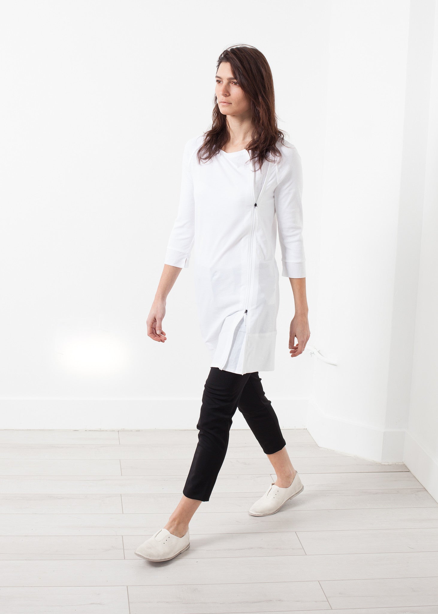 The Berry by Annette Gortz is part tunic, part knit top. 3/4 inch sleeves. Boat neckline. Side double zip at left front. Color Off-White. 92% Cotton, 8% Spandex, Trim 100% Cotton. Made in Germany. Lana is wearing a Small. Lana is 5'7, hips 36.5", waist 25", bust 34.5".