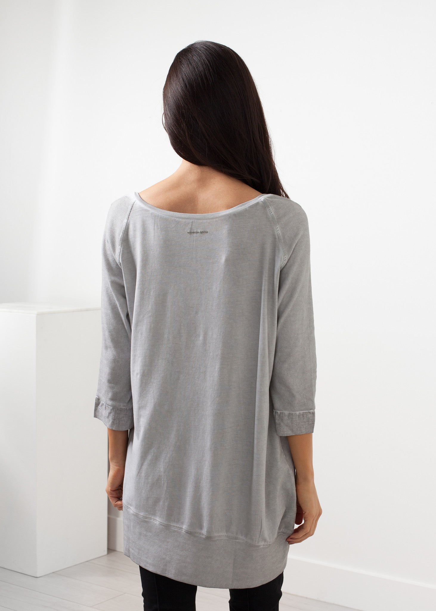 The Berry by Annette Gortz is part tunic, part knit top. 3/4 inch sleeves. Boat neckline. Side double zip at left front. Color Smoke. 92% Cotton, 8% Spandex, Trim 100% Cotton. Made in Germany. Ashley is wearing a Small.